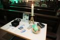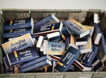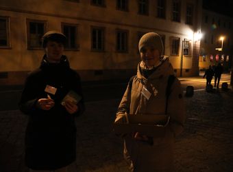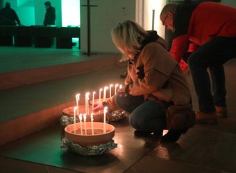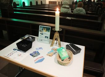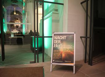 Das Innere der Kirche ist in farbiges Licht getaucht. Im Eingangsbereich können die Besucherinnen und Besucher ihre Gedanken und Hoffnungen auf Postkarten schreiben und unter Bibelkärtchen mit verschiedenen Sprüchen wählen. Wer mag, nimmt als Erinnerung einen Schlüsselanhänger mit dem Anker als Hoffnungszeichen oder eine kleine Streichholzschachtel mit der Aufschrift „Nacht der Hoffnung“ mit. „Ihr macht das so schön, ich danke Ihnen“, sagt eine junge Frau zu den Helfern.