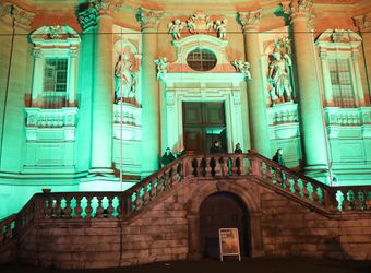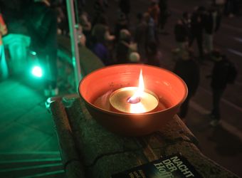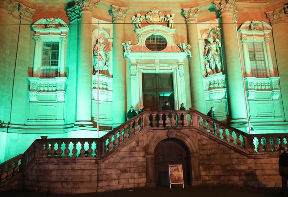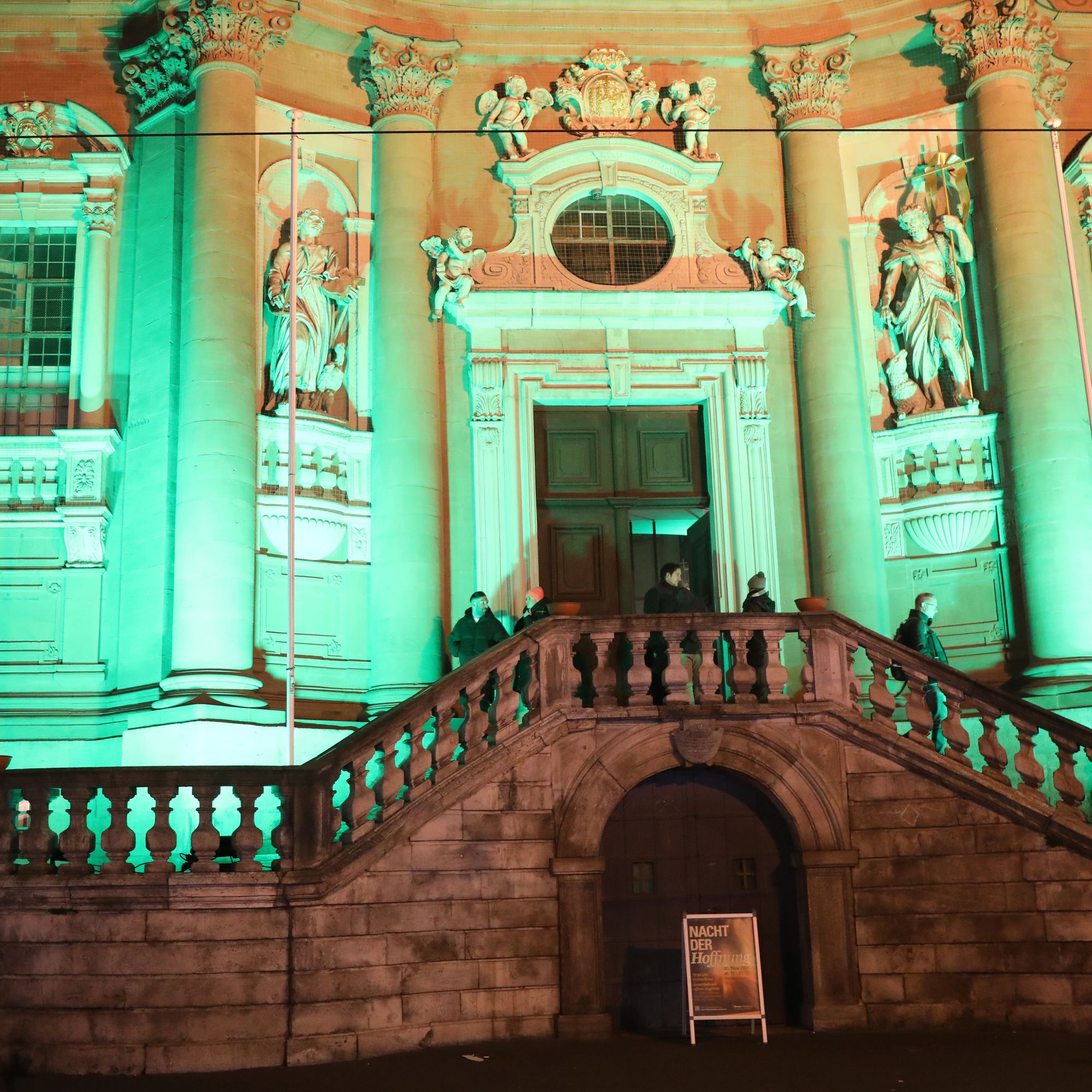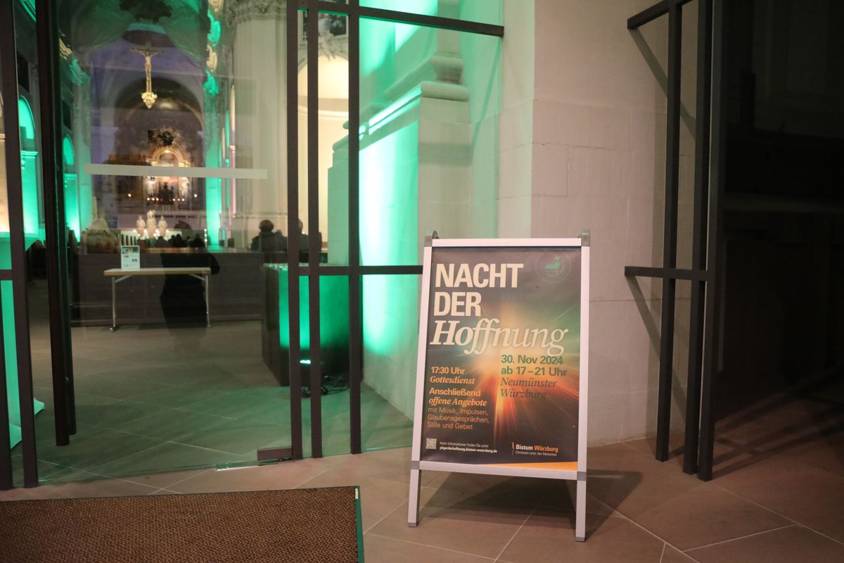 Würzburg (POW) Das Neumünster ist in grünes Licht getaucht, auf der Balustrade des Treppenaufgangs flackern Schalen mit großen Ölbrennern. Davor und auf dem Kiliansplatz verteilen Teams von Helferinnen und Helfern Kerzen an die Passanten. Ein Plakat mit der Aufschrift „Nacht der Hoffnung“ lädt an diesem Samstagabend, 30. November, dazu ein, sich von 17 bis 21 Uhr auf das Heilige Jahr 2025 einzustimmen. Mitten im Trubel des ersten Adventswochenendes und der langen Einkaufsnacht nutzen viele Menschen die Gelegenheit, bei Orgelmusik, Stille und Gebetsimpulsen einen Moment innezuhalten, vor dem Altar eine Kerze zu entzünden und die Atmosphäre auf sich wirken zu lassen. Nach dem Abschluss mit dem „Gebet der Hoffnung“ und dem eucharistischen Segen verlassen die meisten die Kirche mit einem Lächeln. „Schön war’s!“, ist im Vorbeigehen zu hören.