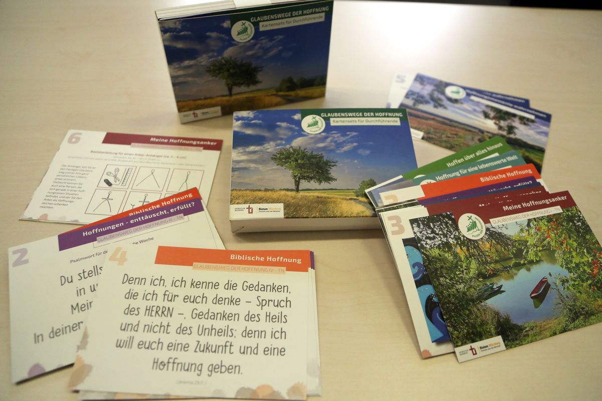 Für Haupt- und Ehrenamtliche, die eine oder mehrere Etappen des „Glaubenswegs der Hoffnung“ vor Ort anbieten wollen, hat das überdiözesane Team Begleitmaterial entwickelt. Dieses umfasst jeweils ein Kartenset sowohl für die Organisatoren als auch für die Teilnehmenden. Die Postkarten enthalten unter anderem Gestaltungshinweise, Impulse sowie Lieder und werden an alle pastoralen Mitarbeitenden in den Pastoralen Räumen über die Dekanatsbüros verteilt. Das Kartenset ist auch online abrufbar unter pilgerderhoffnung.bistum-wuerzburg.de.