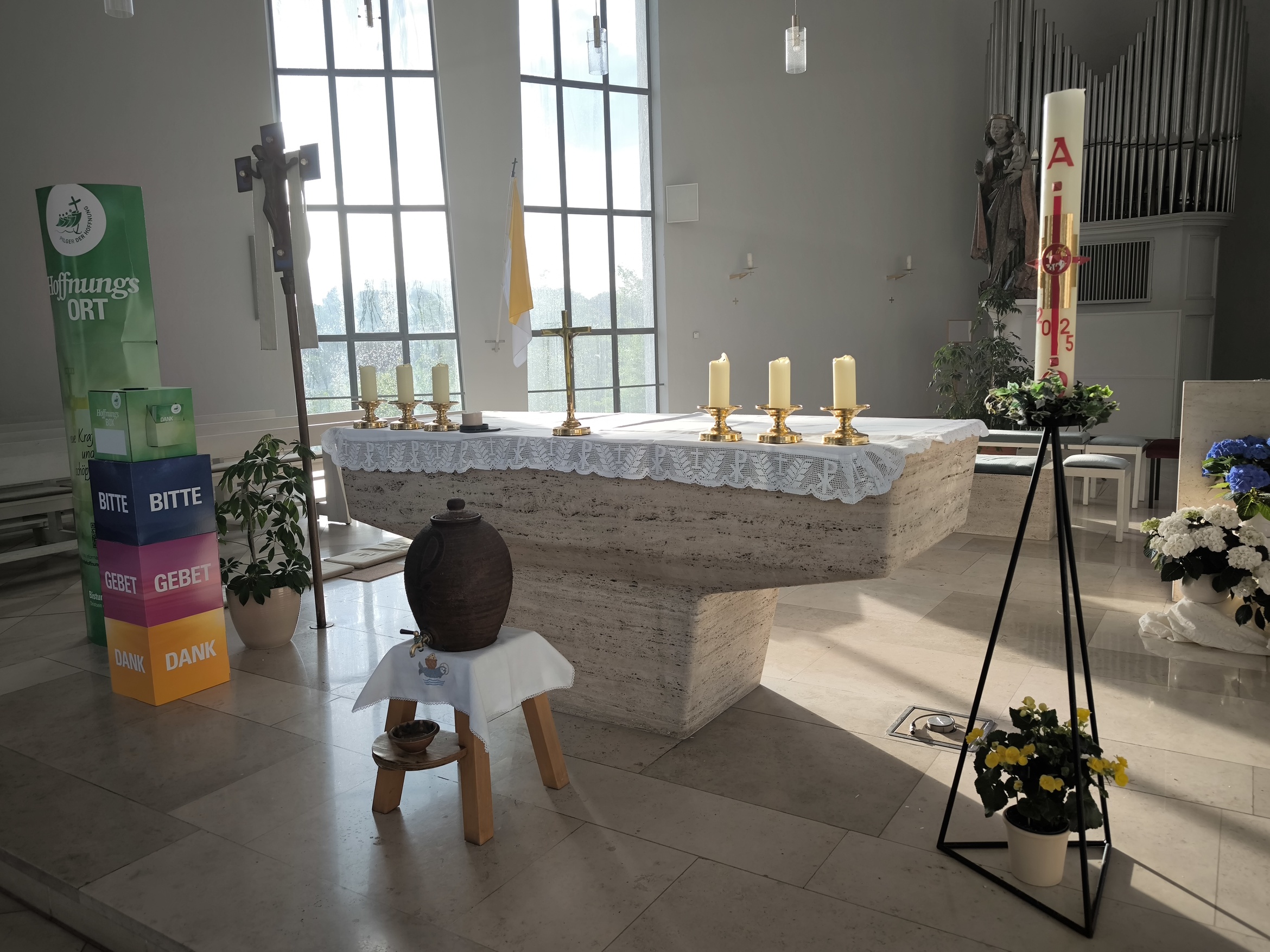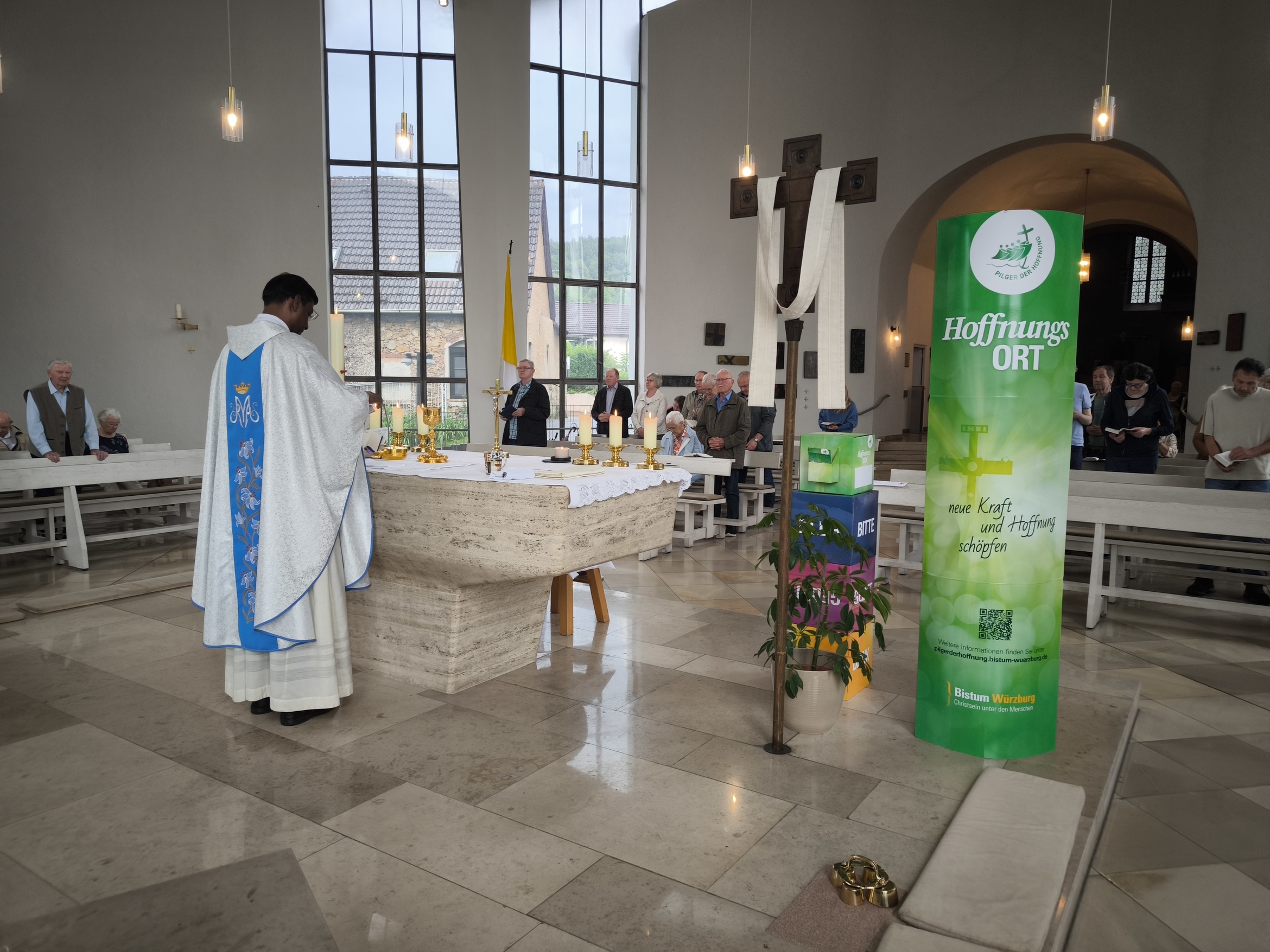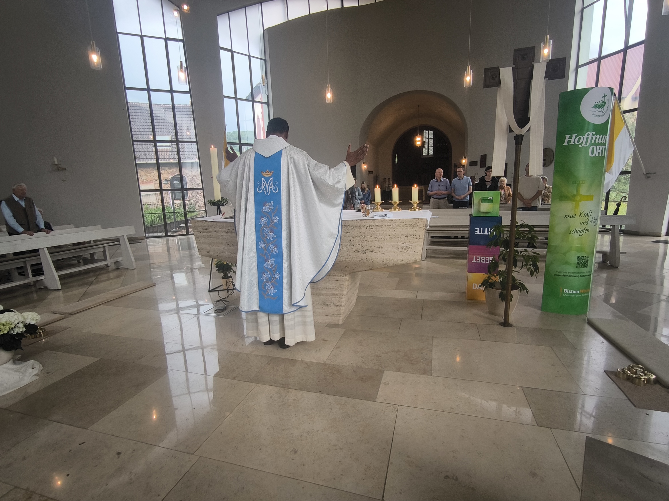 Zu Beginn gab es Impulsgedanken zum Thema „Pilger der Hoffnung“. Der große Gewinn des Glaubens sei es, dass es eine Hoffnung auf einen liebenden Gott gibt, der die Wege des Menschen segnet und begleitet. Zu ihm kann man auch in Not und Sorgen kommen und sie ihm anvertrauen. Das kann durch das Leben tragen und vor Hoffnungslosigkeit und Resignation bewahren. Im Vertrauen sei Maria durch ihr Leben und ihren Glauben ein Vorbild. Die Wallfahrtskirche sei ein Ort, an dem viele Menschen im Gebet und beim Entzünden einer Kerze ihre Hoffnung im Gebet ausdrücken.